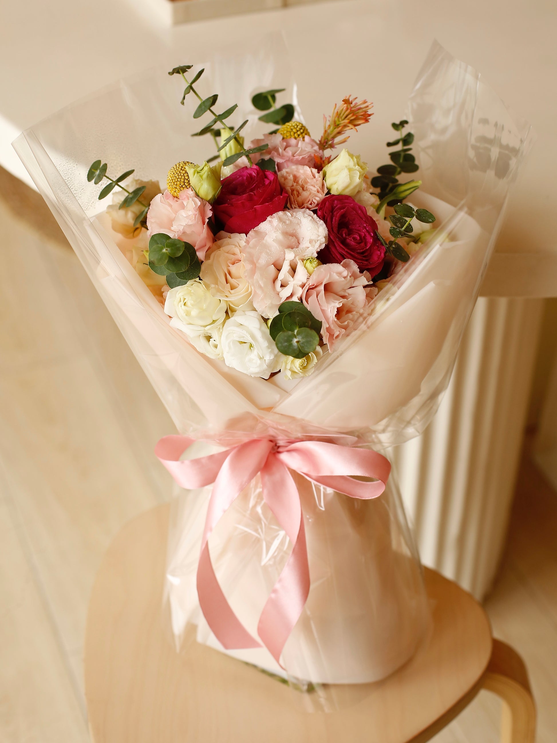 Featuring dreamy bouquet of fresh flowers wrapped with clear and pink ribbon for a classic look.